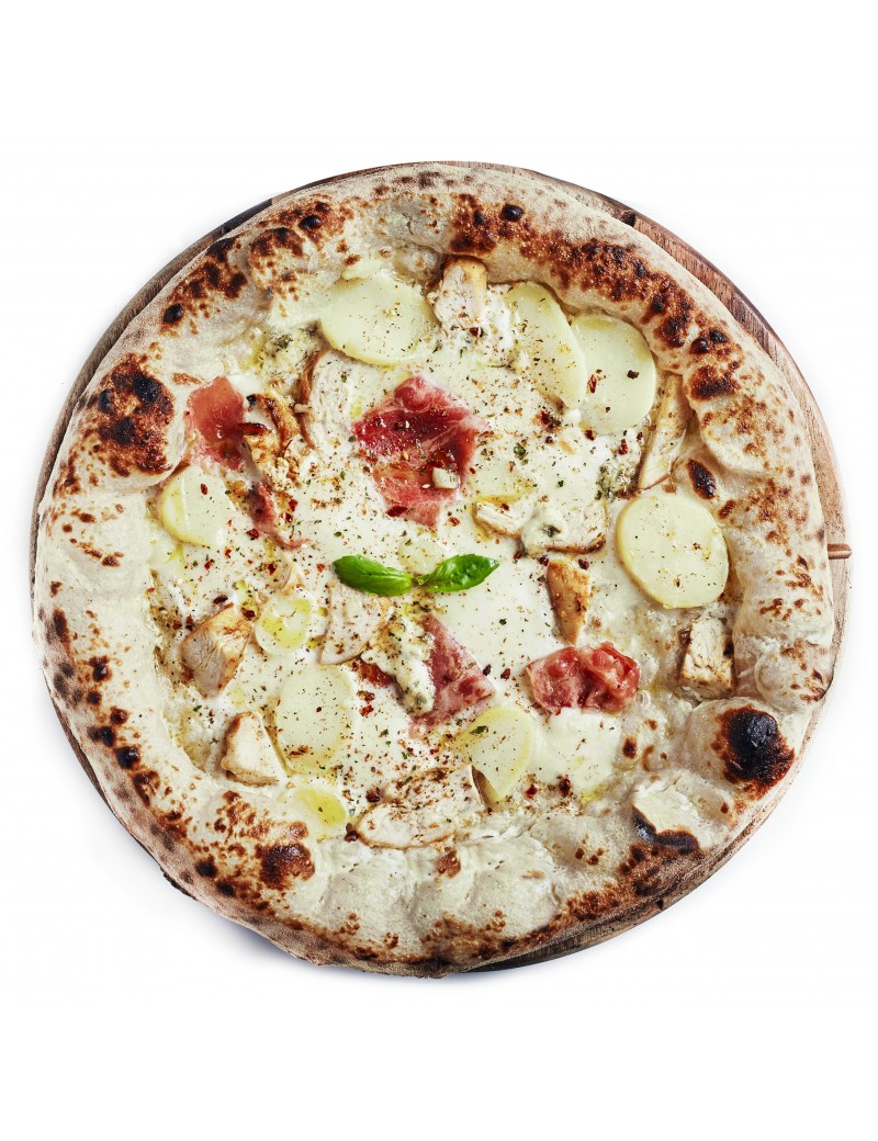 Crème fraîche, mozza, émincés de poulet mariné, jambon de dinde, pomme de terre et fromage bleu d'Auvergne.